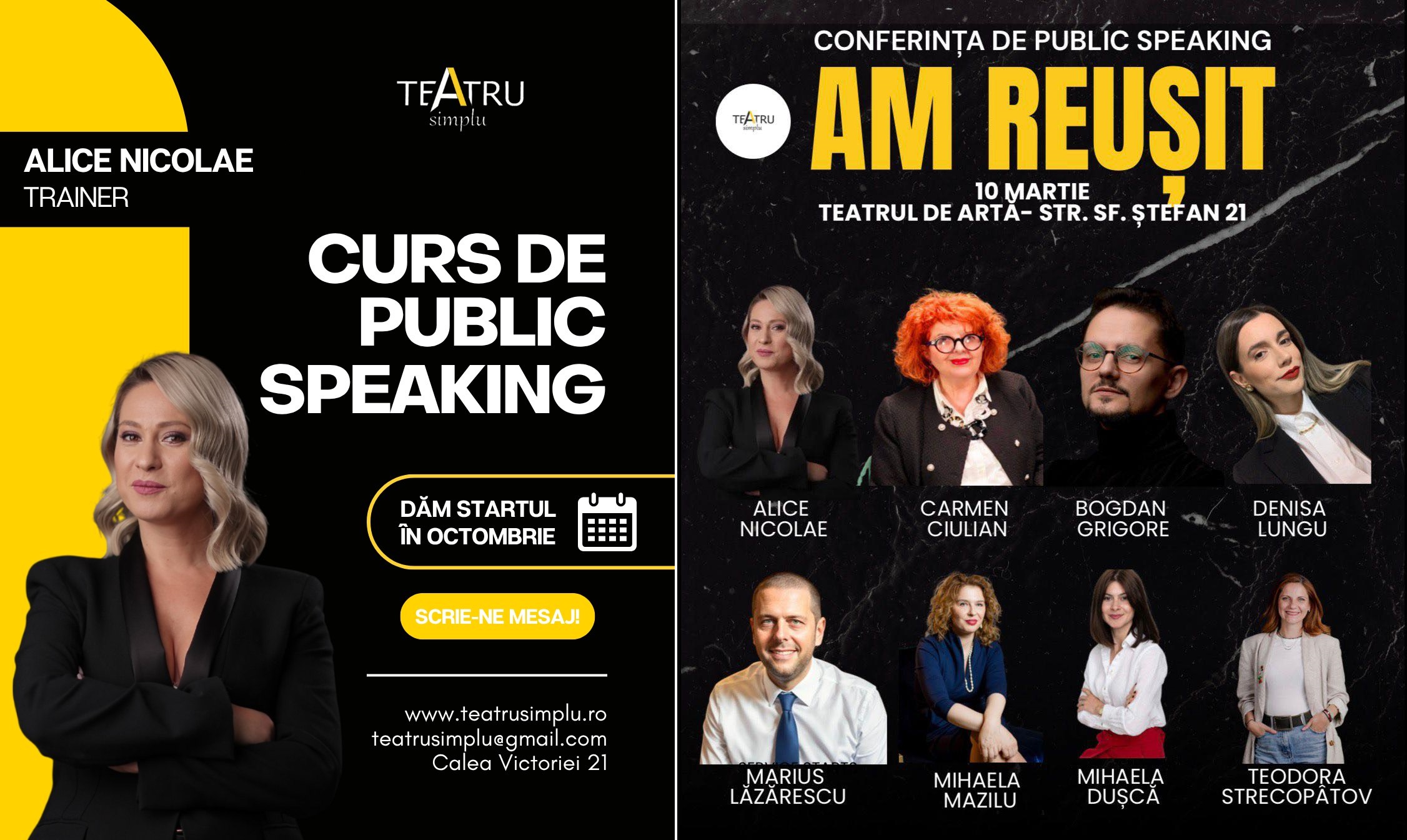 Who were you before you were told who to be? This is one of the questions in a campaign launched by Teatrul Simplu, under the motto “I succeeded!” In addition to acting courses, public speaking workshops are held here, led by its founder, actress Alice Nicolae.