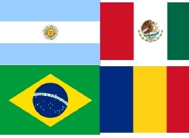 – Steagul Braziliei este format dintr-un pătrat verde. Pe acest pătrat apare un romb galben și in acesta un cerc albastru cu o bandă albă care conține deviza Ordem e Progresso (Ordine și Progres in portugheza) scrisă cu litere de culoare verde și 27 de stele albe de culoare alba. (La bandera de Brasil está formada por un rectángulo verde . Sobre este rectángulo, aparece un rombo amarillo, y dentro de este, un círculo azul con una banda blanca que contiene el lema ORDEM E PROGRESSO («Orden y Progreso» en portugués) con letras de color verde, y 27 estrellas de color blanco.)
