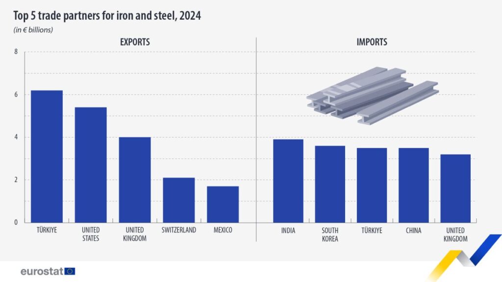 Turcia a fost principalul partener comercial al UE pentru fier și oțel, situându-se pe primul loc la exporturi, cu un total de 6,2 miliarde de euro, și pe locul trei la importuri, cu 3,5 miliarde de euro.