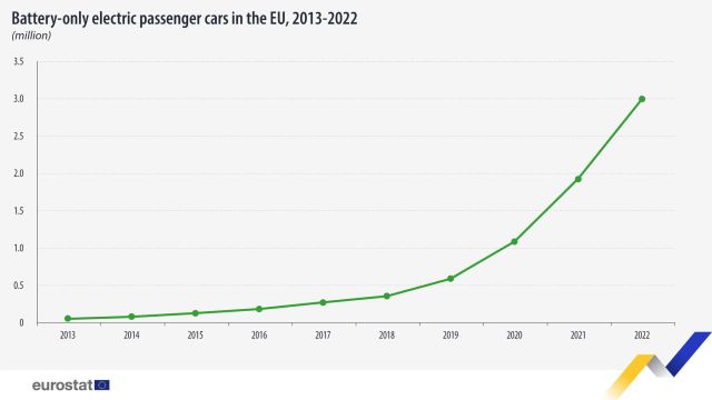 Aproape trei milioane de autovehicule alimentate exclusiv cu baterii erau înregistrate în statele membre ale UE, arată datele Eurostat pentru anul 2022. Aceasta înseamnă o creștere de 55% față de anul precedent când erau înmatriculate 1,9 milioane de unități în spațiul comunitar.