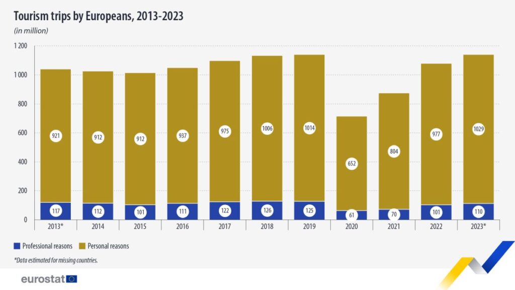 Cetățenii din Uniunea Europeană au efectuat un total de 1,14 miliarde de călătorii turistice cu cel puțin o noapte de cazare, conform datelor publicate de Oficiul Europeant pentru Statisică (Eurostat). Aceasta reprezintă o creștere de 5,7% față de 2022, ceea ce înseamnă cu aproximativ 61,6 milioane mai multe călătorii.
