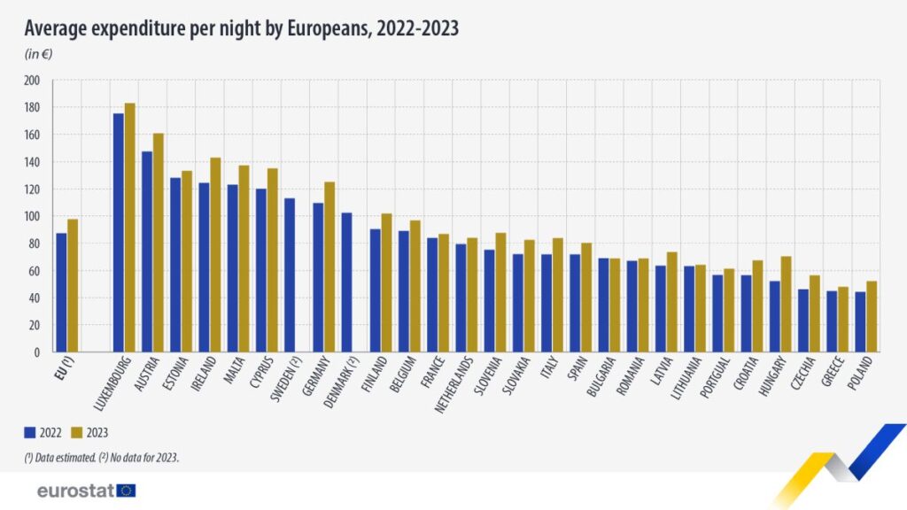 În ceea ce privește turiștii care au cheltuit cel mai mult, cei din Luxemburg ocupă prima poziție, cu o medie de 183 de euro pe noapte. Ei sunt urmați de turiștii din Austria, care au cheltuit 161 de euro, și de cei din Irlanda, cu o medie de 143 de euro pe noapte. La polul opus se află turiștii din Grecia, care au cheltuit doar 48 de euro pe noapte, urmați de cei din Polonia (52 de euro) și Cehia (57 de euro).