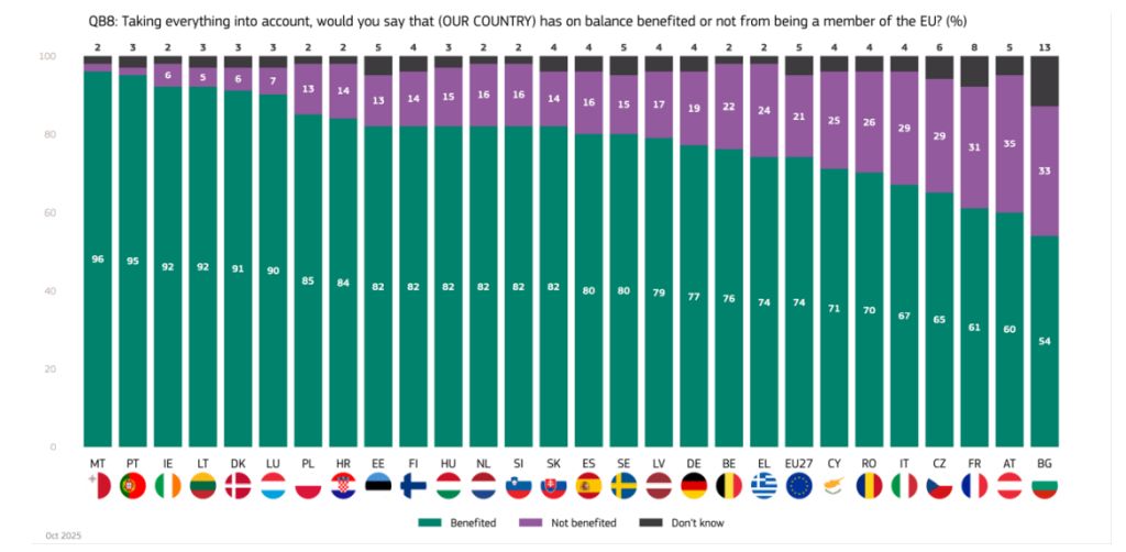 Majoritatea cetățenilor UE consideră că țara lor a beneficiat de statutul de membru al blocului comunitar. Sprijinul pentru moneda euro, dar și pentru apărarea și securitatea comună se află la cote foarte ridicate, potrivit Eurobarometrului de toamnă.