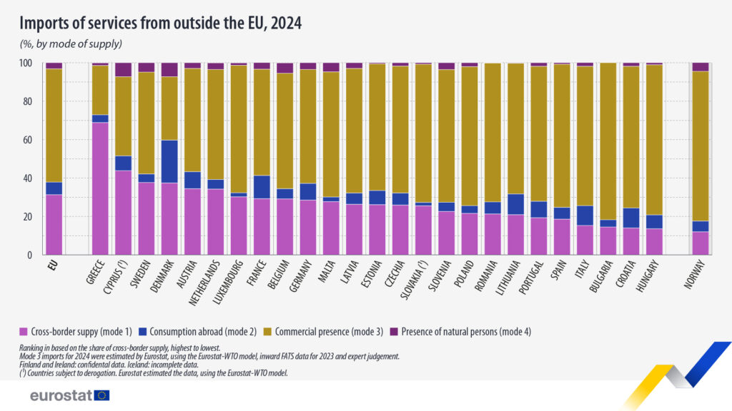 În mod firesc, în 22 de state membre ale UE, majoritatea importurilor de servicii au provenit printr-o prezență comercială pe teritoriul lor (modul 3). Cele mai mari ponderi ale importurilor prin prezență comercială s-au înregistrat în Bulgaria (81,7%), Ungaria (78,1%) și Spania (74,5%). Și în România, modul 3 a reprezentat peste 70% dintre importuri. În schimb, furnizarea transfrontalieră (modul 1) a fost modul dominant în Grecia, cu pese două treimi din importuri (68,8%). Cipru (43,8%), Suedia (37,7%) și Danemarca (37,4%) au raportat, de asemenea, ponderi mai ridicate.