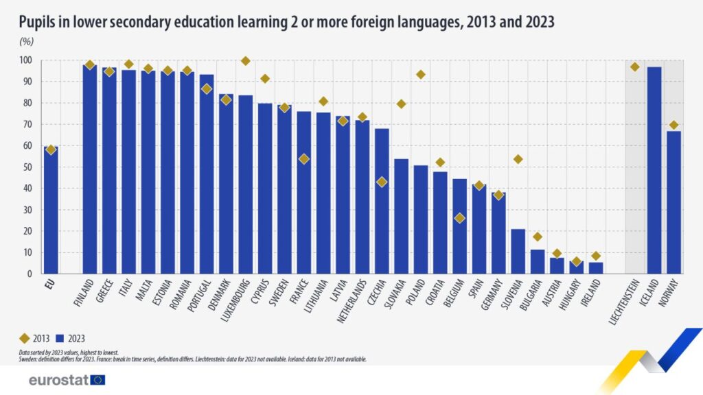 În Finlanda, țara UE cu cea mai mare pondere, aproape toți elevii din învățământul gimnazial (cu 97,8%) luau lecții pentru cel puțin două limbi străine. România, alături de alte cinci state membre a avut proporție de peste 90%. Statele membre cu cele mai scăzute proporții au fost Irlanda (5,4%), Ungaria (6,1%) și Austria (7,6%).