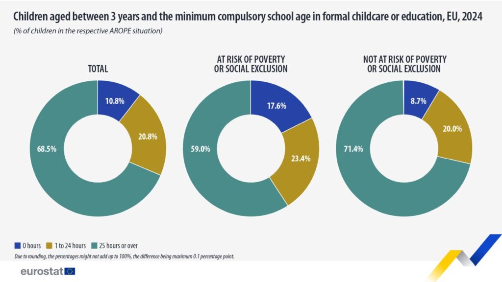 Cifrele sunt mai mici în rândul copiilor expuși riscului de sărăcie sau excluziune socială. Astfel, doar 59,0% dintre copii afectați de sărăcie au beneficiat de îngrijire sau educație formală timp de 25 de ore sau mai mult, comparativ cu 71,4% dintre minorii care nu sunt expuși acestui risc. Totodată, 17,6% dintre copiii expuși riscului nu au fost încadrați în grădinițe, de două ori mai mult față de copii neafectați de sărăcie (8,7%).