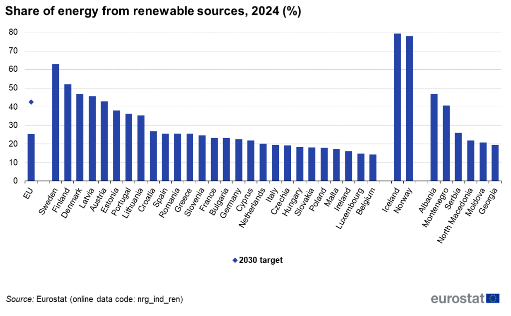 Datele pentru anul 2024 arată că un sfert din consumul final brut de energie al Uniunii (25,2%) a fost produsă din surse regenerabile, de aproape trei ori mai mult decât în 2004 (9,6%). Uniunea Europeană are ca obiectiv ca energia din surse regenerabile să reprezinte 42,5% din consumul total până în 2030. Astfel, statele membre ale UE trebuie să își intensifice eforturile pentru a respecta colectiv ținta pentru 2030, ceea ce presupune creșterea ponderii energiei regenerabile în consumul final brut de energie al UE cu peste 17 pp în doar 6 ani.
