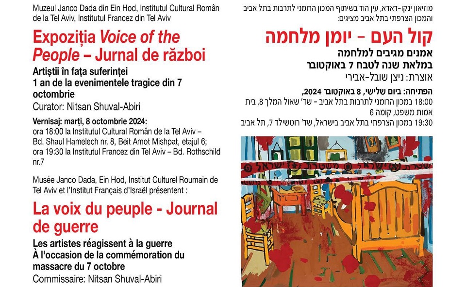 התערוכה "קול העם יומן מלחמה" תיפתח בתל אביב ב-8 לאוקטובר, ב-3 מוסדות תרבות. התערוכה מציינת שנה לטרגדיה של 7 לאוקטובר 2023 ומאז המלחמה שפרצה אז. הפרויקט הוא פרי שיתוף פעולה בין שלושה מוסדות: מוזיאון ינקודאדא בעין הוד, מכון התרבות הרומני בתל אביב והמכון הצרפתי לתרבות בתל אביב.