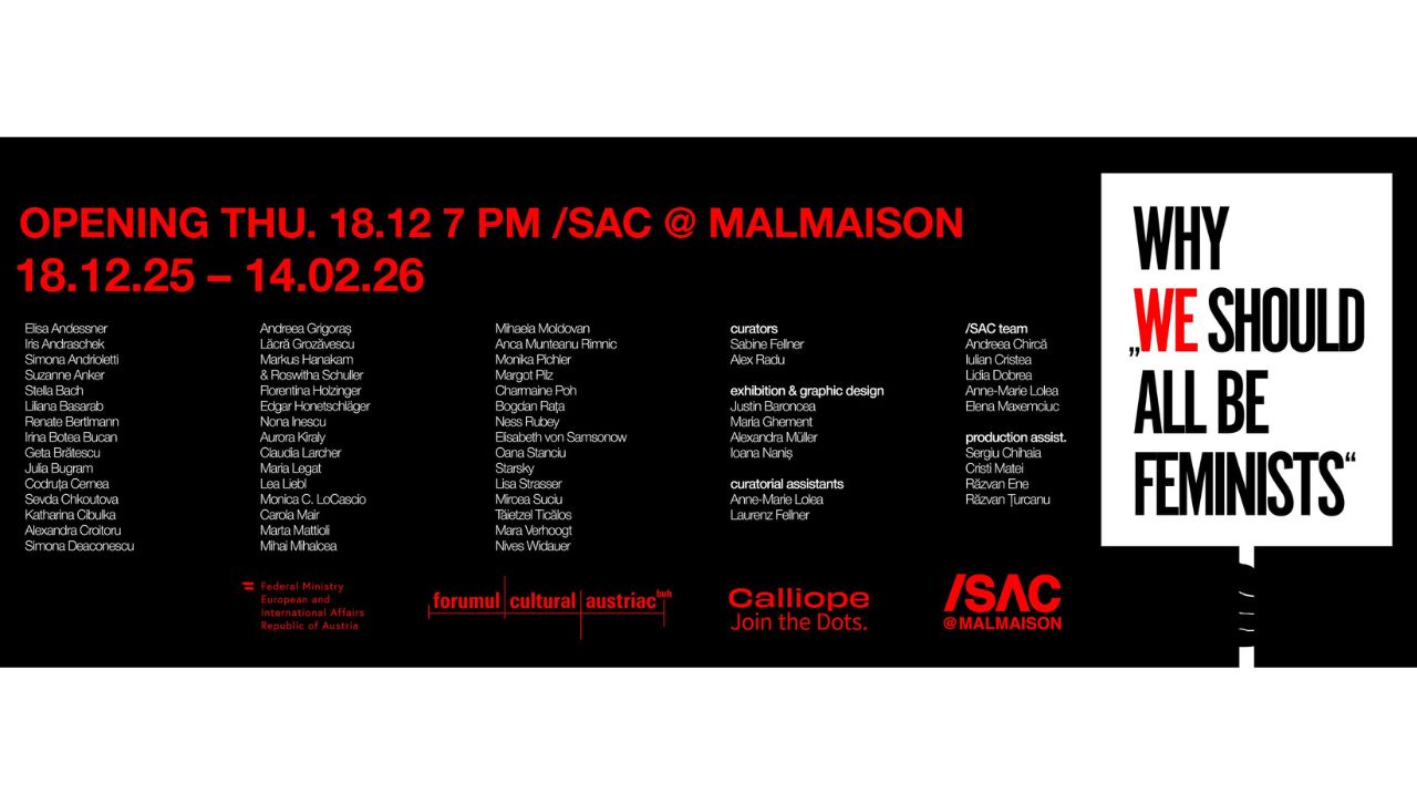 După succesul din 2024 al expoziției „Touch Nature”, curatorii Sabine Fellner și Alex Ion Radu reunesc lucrările a 45 de artiste și artiști de calibru din România și Austria într-un nou proiect de anvergură, care demontează tabuuri. Expoziția „Why We Should All Be Feminists / De ce ar trebui să fim cu toții feministe/feminiști” este o pledoarie pentru o schimbare a modului în care ne-am obișnuit să răspundem unor dinamici sociale vechi și pentru construirea unora noi. Expoziția a fost deschisă la sfârșitul lunii decembrie și este organizată de /SAC – Spațiul de Artă Contemporană și Forumul Cultural Austriac, cu sprijinul Ministerului Austriac al Afacerilor Europene și Internaționale. Artistele și artiștii din cele două țări încearcă să propună soluții și idei pentru comunități mai echitabile și mai sustenabile, care acceptă diversitatea și diferențele și manifestă mai multă grijă pentru membrii lor. Lucrările, toate de mare impact, sunt extrem de diverse: de la desen și pictură la artă video și instalație, proiecte de artă contemporană din secolele XX și XXI. Expoziția face parte din proiectul internațional „Why We Should All Be Feminists”, conceput de Sabine Fellner și dezvoltat în numeroase țări de pe glob, în colaborare cu rețeaua Forumurilor Culturale Austriece.