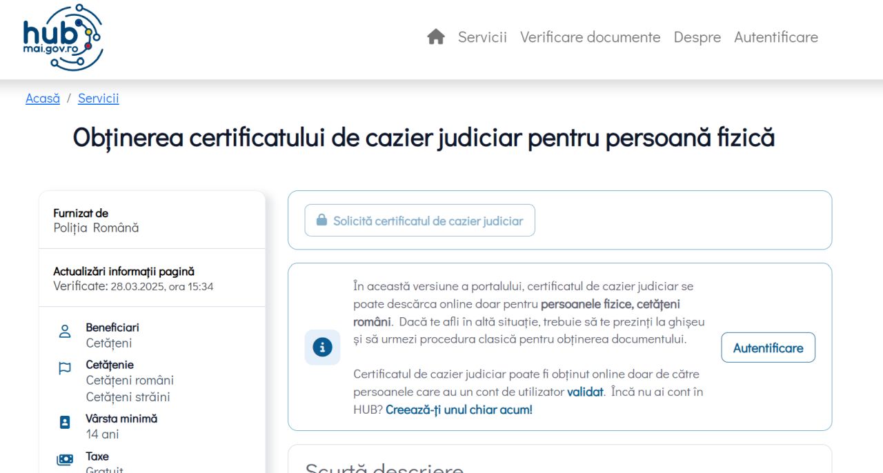 Acest serviciu electronic a fost primul lansat către public, varianta pilot fiind disponibilă de pe 1 februarie 2023, iar din ianuarie 2024, orice persoană fizică cu cetăţenie română a putut să obţină documentul electronic, indiferent de prezenţa sau lipsa antecedentelor penale. Toate activităţile legate de operaţionalizarea portalului HUB-ul de servicii la nivelul MAI, precum şi de dezvoltare a aplicaţiei au fost executate exclusiv prin resurse umane proprii MAI şi ale Inspectoratului General al Poliţiei Române, în mai puţin de cinci luni calendaristice.