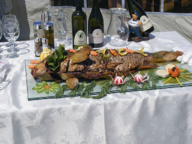 Presupunem că avem un crap de 2 … 3 kg, pe care îl curăţăm de solzi, îl eviscerăm, îl spălăm şi îl porţionăm tăindu-l transversal în felii cu o grosime de 2 … 3 cm. Presărăm sare pe aceste medalioane de peşte şi le lăsăm la rece. Spălăm bucăţile de peşte pentru a indepărta surplusul de sare înainte de a le pune în lada frigorifică. Ajunşi la iarbă verde, încingem grătarul şi punem medalioanele deasupra jarului după ce le-am uns puţin cu ulei pentru a nu se lipi. Le lăsăm să se rumenească pe ambele părţi, iar apoi le punem într-o cratiţă cu capac. Separat, pregătim un sos de roşii din jumătate de kg de roşii, două căpăţâni de usturoi, un ardei iute şi o legătura de pătrunjel verde. Fierbem puţină apă în care adăugăm roşiile mărunţite, usturoiul tăiat în felii subţiri, la fel şi rondele de ardei şi, frunzele tocate de pătrunjel. Acest sos îl turnăm peste medalioanele de crap aflate deja în cratiţă. Se serveşte cu mămăligă şi, neapărat, cu un vin alb şi sec.