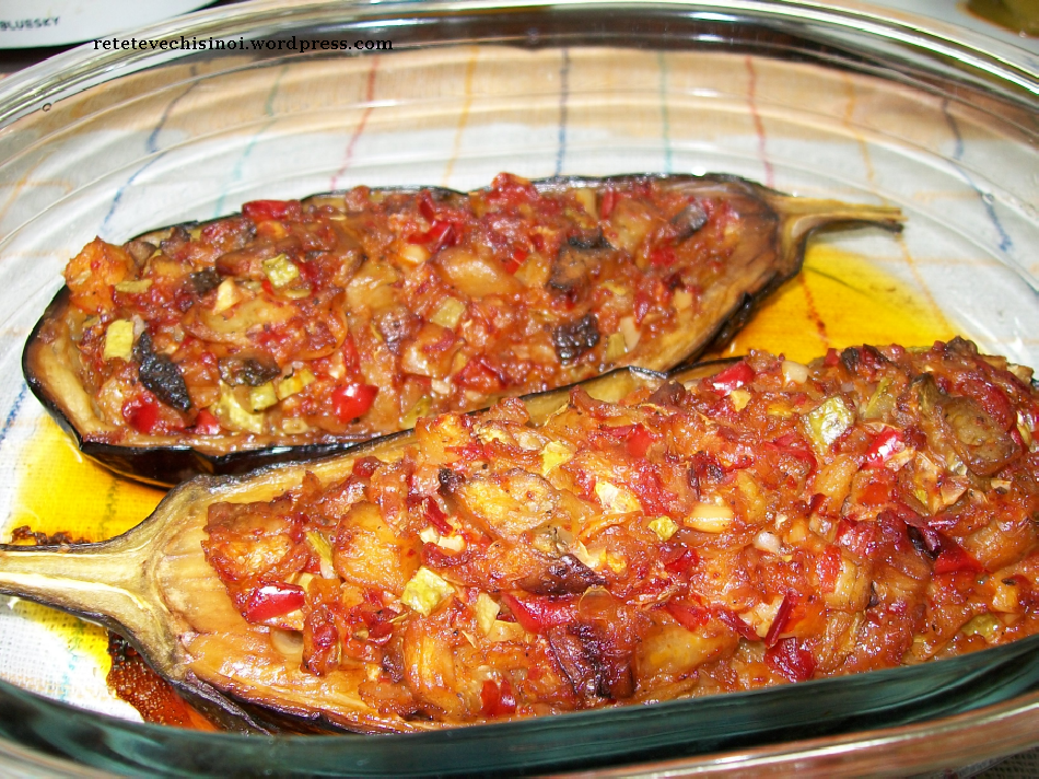 Punem apoi jumătăţile de vinete într-o tavă, iar în scobiturile pe care le facem în interiorul lor prin presare, cu o lingură, turnăm acest amestec de legume călite în care adăugăm şi frunzele de pătrunjel, tocate mărunt şi ardeiul iute, tăiat în felii subţiri. Băgăm tava la cuptor la foc potrivit pentru o jumătate de oră, după care punem jumătăţile de vinete în farfurii, presărând deasupra pătrunjel verde tocat. Poftă bună sau, dacă doriţi, leşin plăcut!