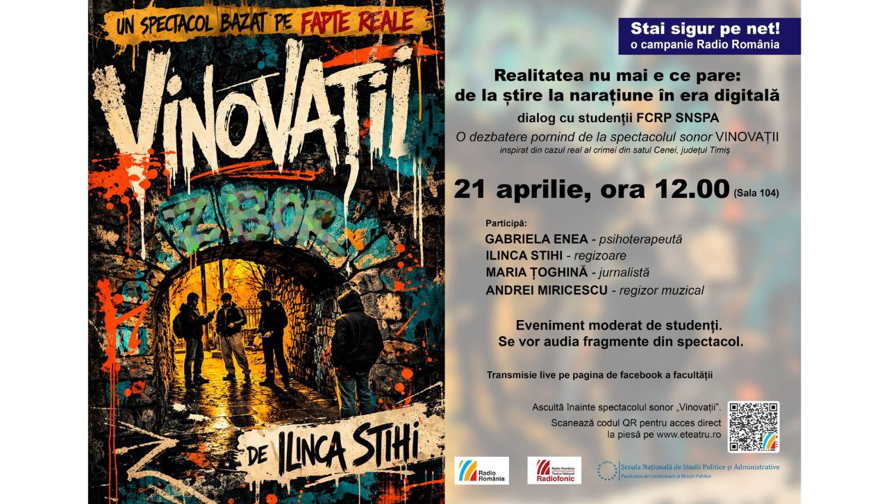 Evenimentul pornește de la spectacolul sonor „Vinovații”, semnat de Ilinca Stihi și inspirat din cazul real al crimei din Cenei, propunând o reflecție asupra modului în care realitatea este construită, reinterpretată și uneori distorsionată în mediul media contemporan.